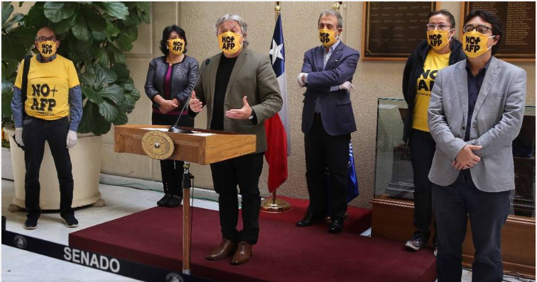 Durante la jornada de este miércoles, los senadores Alejandro Navarro (PRO), Juan Ignacio Latorre (RD), Alfonso De Urresti (PS), junto a las senadoras Yasna Provoste (DC) y Ximena Órdenes (IND), y representantes de la Coordinadora «No + AFP» encabezados por Luis Mesina, presentaron en el Senado el proyecto de ley que busca derogar el decreto ley 3.500 de 1981, nacionalizar los fondos administrados por las AFP y crear una nueva institucionalidad para la administración de los fondos de pensiones.