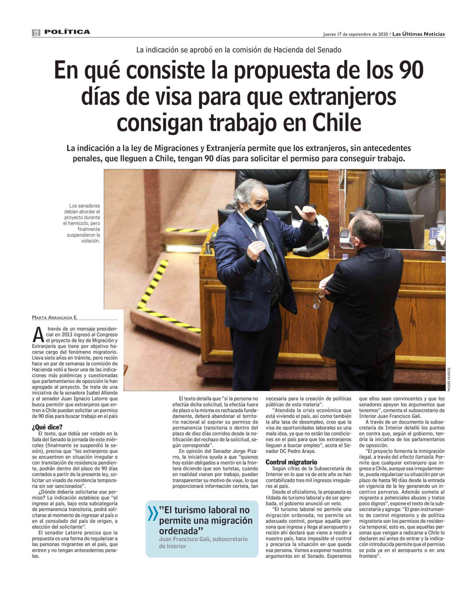Desde el oficialismo, la propuesta es tildada de turismo laboral y de ser aprobada, el gobierno anunció un veto. ‘El turismo laboral no permite una migración ordenada, no permite un adecuado control, porque aquella persona que ingresa y llega al aeropuerto y recién ahí declara que viene a residir a nuestro país, hace imposible el control y precariza la situación en que queda esa persona. Vamos a exponer nuestros argumentos en el Senado. Esperamos que ellos sean convincentes y que los senadores apoyen los argumentos que tenemos’, comenta el subsecretario de Interior Juan Francisco Gali.
