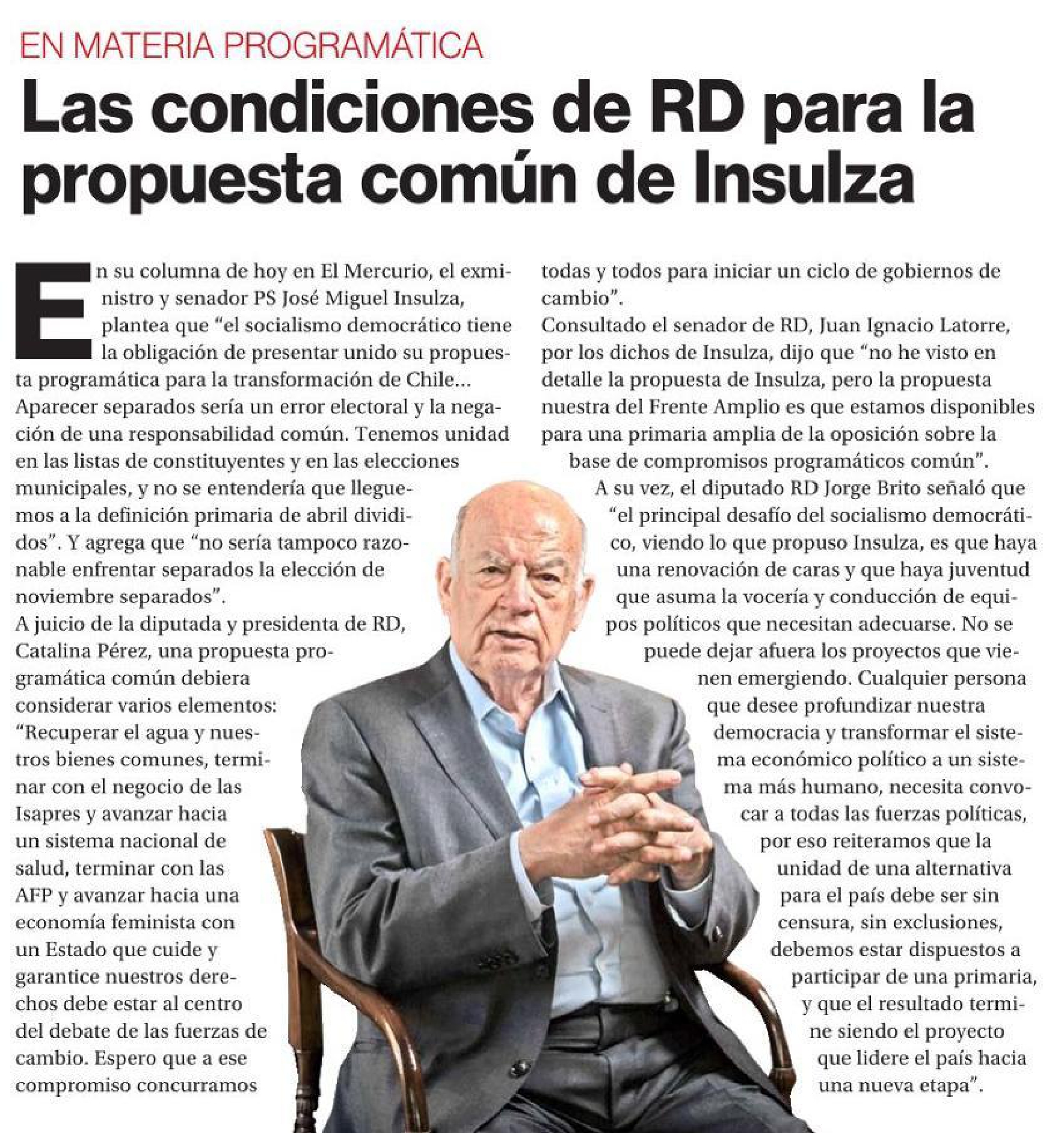 A su vez, el diputado RD Jorge Brito señaló que ‘el principal desafío del socialismo democrático, viendo lo que propuso Insulza, es que haya una renovación de caras y que haya juventud que asuma la vocería y conducción de equipos políticos que necesitan adecuarse. No se puede dejar afuera los proyectos que vienen emergiendo. Cualquier persona que desee profundizar nuestra democracia y transformar el sistema económico político a un sistema más humano, necesita convocar a todas las fuerzas políticas, por eso reiteramos que la unidad de una alternativa para el país debe ser sin censura, sin exclusiones, debemos estar dispuestos a participar de una primaria, y que el resultado termine siendo el proyecto que lidere el país hacia una nueva etapa’.