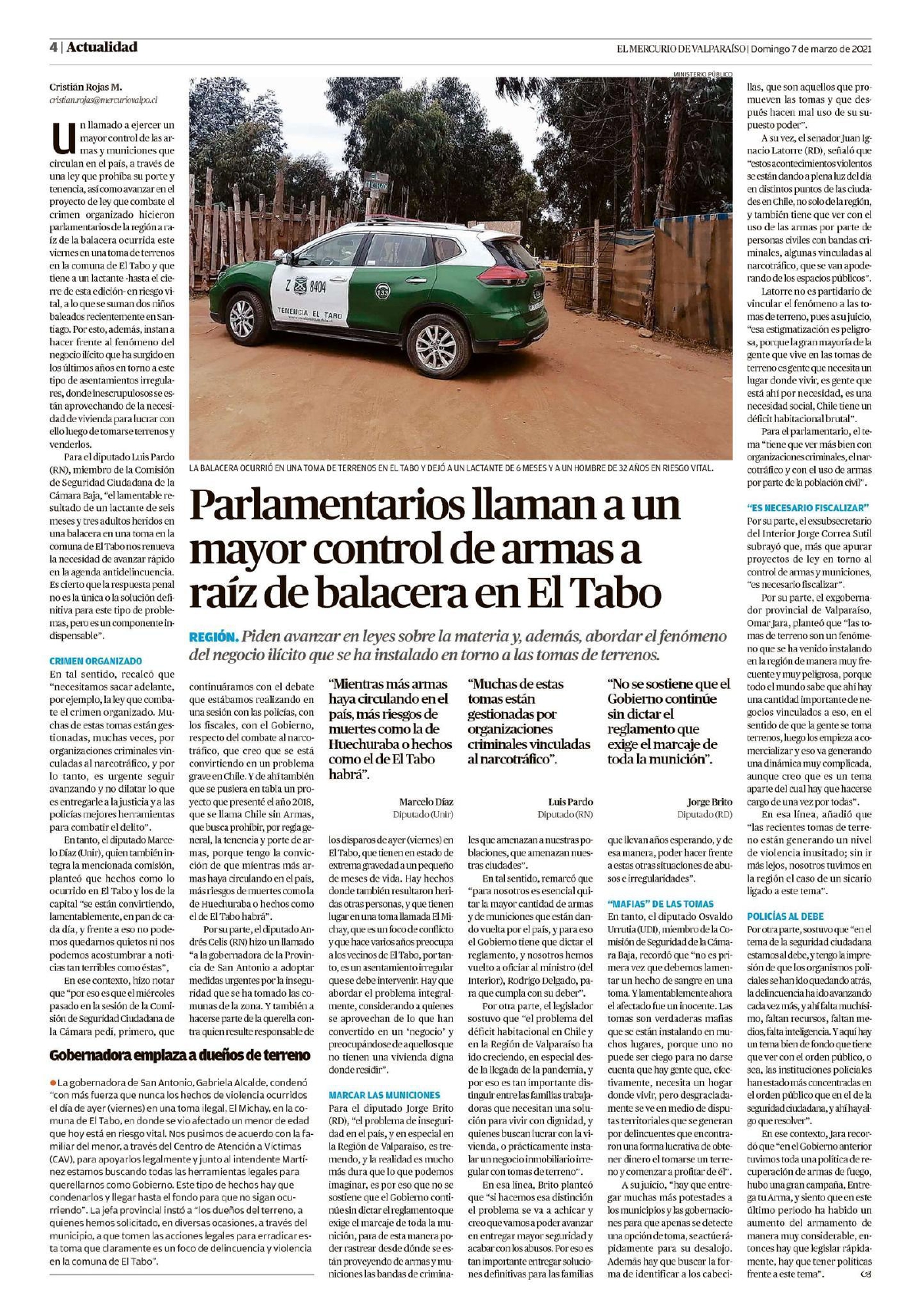 Para el diputado Luis Pardo (RN), miembro de la Comisión de Seguridad Ciudadana de la Cámara Baja, «el lamentable resultado de un lactante de seis meses y tres adultos heridos en una balacera en una toma en la comuna de El Tabo nos renueva la necesidad de avanzar rápido en la agenda antidelincuencia. Es cierto que la respuesta penal no es la única o la solución definitiva para este tipo de problemas, pero es un componente indispensable».