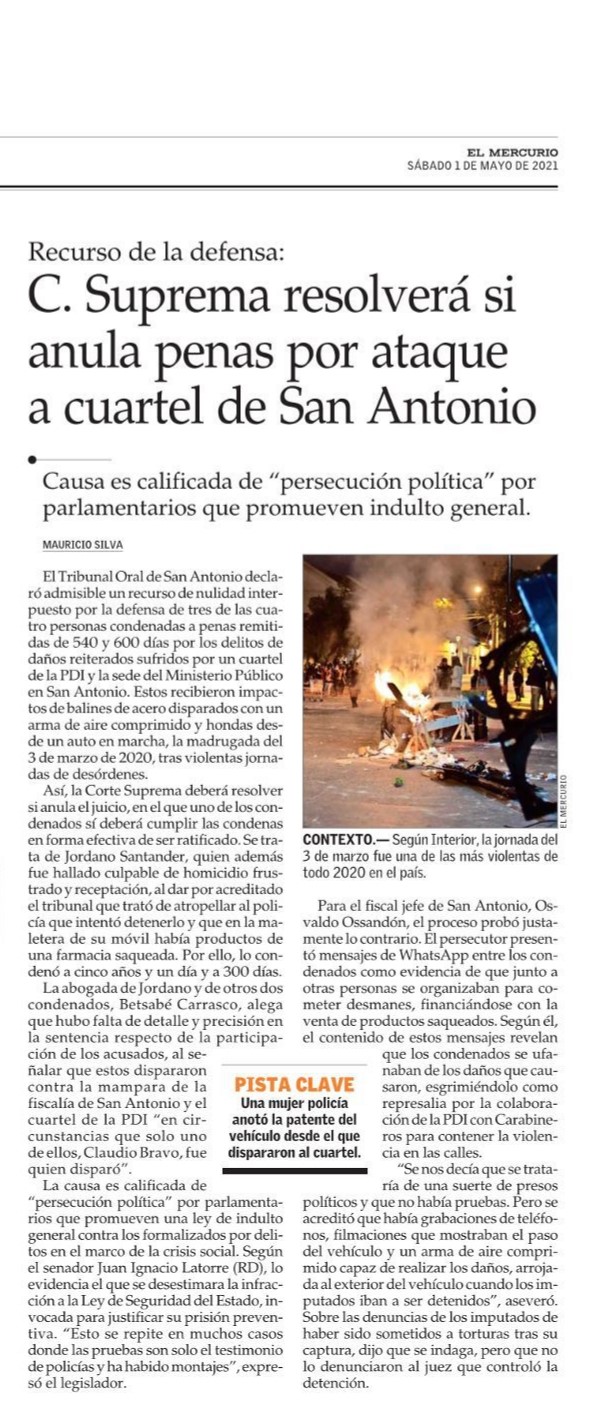 El Tribunal Oral de San Antonio declaró admisible un recurso de nulidad interpuesto por la defensa de tres de las cuatro personas condenadas a penas remitidas de 540 y 600 días por los delitos de daños reiterados sufridos por un cuartel de la PDI y la sede del Ministerio Público en San Antonio. Estos recibieron impactos de balines de acero disparados con un arma de aire comprimido y hondas desde un auto en marcha, la madrugada del 3 de marzo de 2020, tras violentas jornadas de desórdenes.