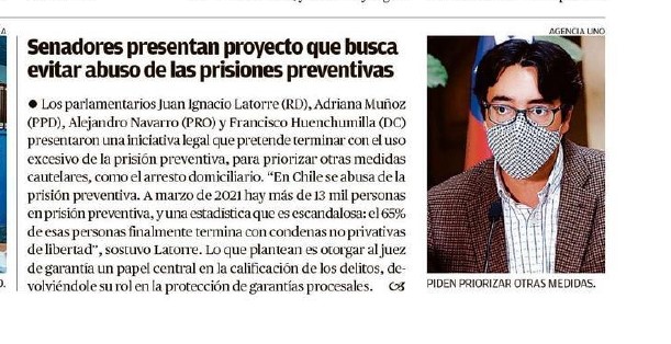 Los parlamentarios Juan Ignacio Latorre (RD), Adriana Muñoz (PPD), Alejandro Navarro (PRO) y Francisco Huenchumilla (DC) presentaron una iniciativa legal que pretende terminar con el uso excesivo de la prisión preventiva, para priorizar otras medidas cautelares, como el arresto domiciliario. «En Chile se abusa de la prisión preventiva. A marzo de 2021 hay más de 13 mil personas en prisión preventiva, y una estadística que es escandalosa: el 65% de esas personas finalmente termina con condenas no privativas de libertad», sostuvo Latorre. Lo que plantean es otorgar al juez de garantía un papel central en la calificación de los delitos, devolviéndole su rol en la protección de garantías procesales.