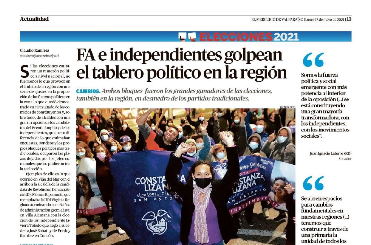 Si las elecciones causaron un remezón político a nivel nacional, no fue menos lo que provocó en el ámbito de la región con una serie de ajustes en la proporción de las fuerzas políticas en la zona lo que quedó demostrado en el resultado de los comicios de constituyentes y, sobre todo, de alcaldes con una gran irrupción de los candidatos del Frente Amplio y de los independientes, quienes a diferencia de lo que estimaban encuestas, sondeos y los propios bloques políticos más tradicionales, ocuparon las plazas dejadas por los jefes comunales que no pudieron ir a la reelección.