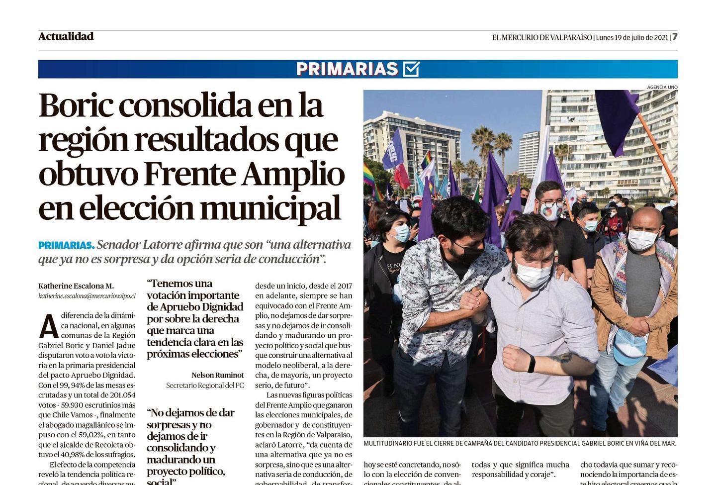 A diferencia de la dinámica nacional, en algunas comunas de la Región Gabriel Boric y Daniel Jadue disputaron voto a voto la victoria en la primaria presidencial del pacto Apruebo Dignidad. Con el 99, 94% de las mesas escrutadas y un total de 201.054 votos – 59.930 escrutinios más que Chile Vamos -, finalmente el abogado magallánico se impuso con el 59,02%, en tanto que el alcalde de Recoleta obtuvo el 40,98% de los sufragios.