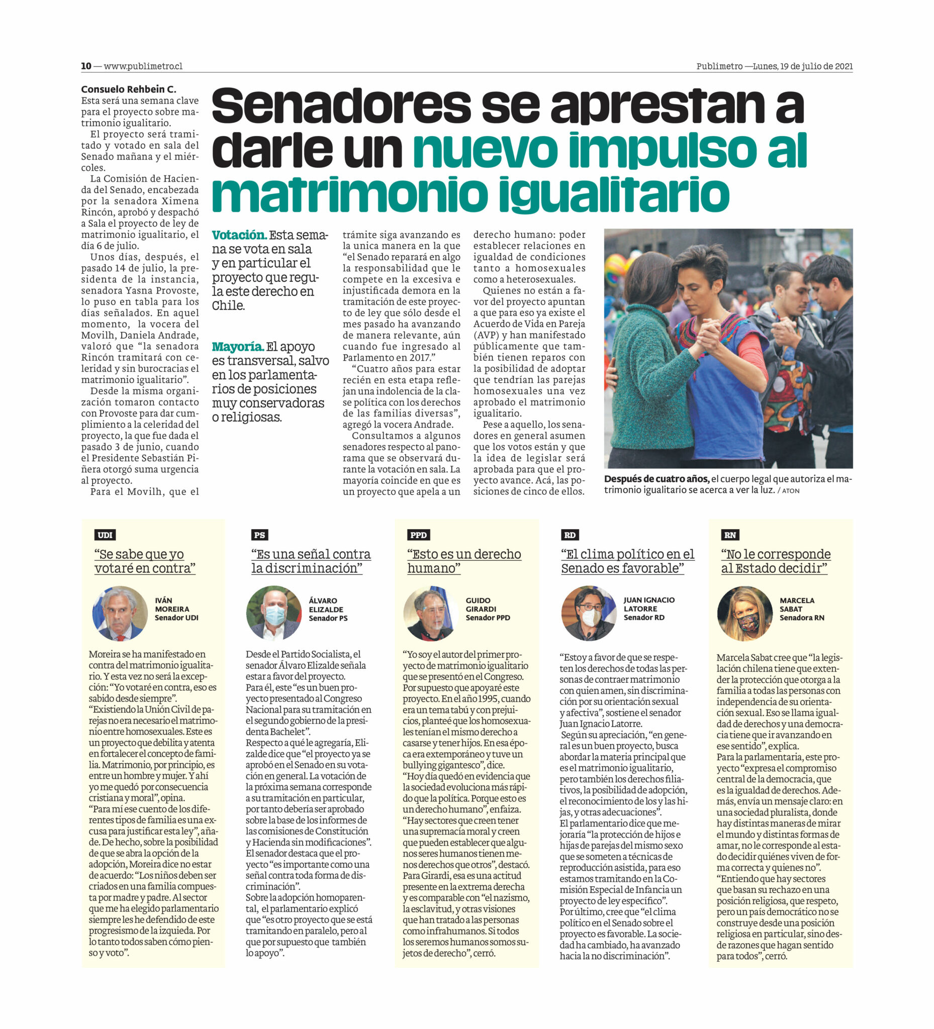 La Comisión de Hacienda del Senado, encabezada por la senadora Ximena Rincón, aprobó y despachó a Sala el proyecto de ley de matrimonio igualitario, el día 6 de julio. Unos días, después, el pasado 14 de julio, la presidenta de la instancia, senadora Yasna Provoste, lo puso en tabla para los días señalados. En aquel momento, la vocera del Movilh, Daniela Andrade, valoró que ‘la senadora Rincón tramitará con celeridad y sin burocracias el matrimonio igualitario’.