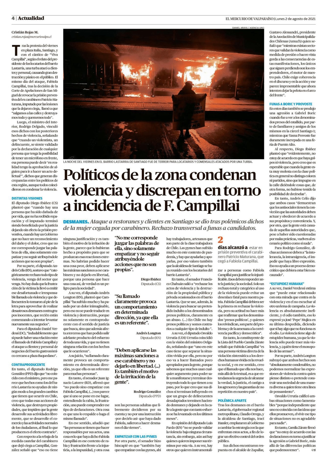 DESMANES. Ataque a restoranes y clientes en Santiago se dio tras polémicos dichos de la mujer cegada por carabinero. Rechazo transversal a funas a candidatos.Tras la protesta del viernes en plaza Italia, Santiago, y con el cántico de «Viva Campillai», según el relato del presidente de los locatarios del barrio Lastania, tina turba atacó a dientes y personal, causando gran destrucción y pánico en el público. El mismo día del ataque, Fabiola Campillai, tras la decisión de la Corte de Apelaciones de San Miguel de revocar la prisión preventiva del ex carabinero Patricio Maturana, imputado por las lesiones que la dejaron ciega, llamó a que «salgamos a las calles y destruyamos todo y quememos todo».