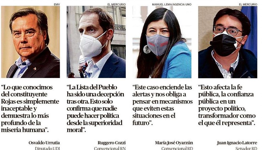 Lo mínimo es la expulsión inmediata de la Convención». Un juicio similar entregó su par Osvaldo Urrutia (UDI). «Lo que conocimos del constituyente Rojas es simplemente inaceptable y demuestra lo más profundo de la miseria humana el ser capaz de inventar el padecimiento de una enfermedad para lograr ganar tina elección. Y peor aún es la capacidad que tienen muchas personas cercanas alas Lista del Pueblo y el Frente Amplio para avalar y justificar esta situación», sostuvo, pidiendo también la renuncia de Rojas Vade al ente.
